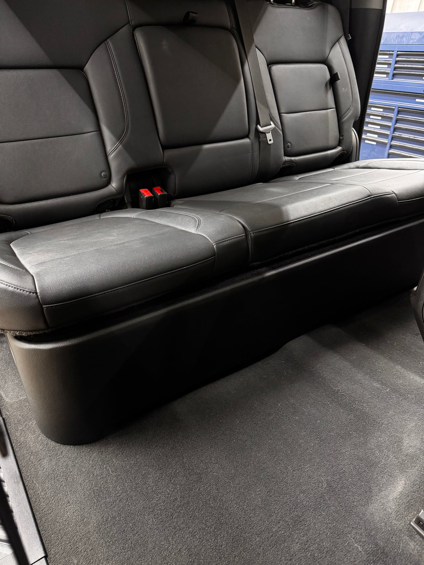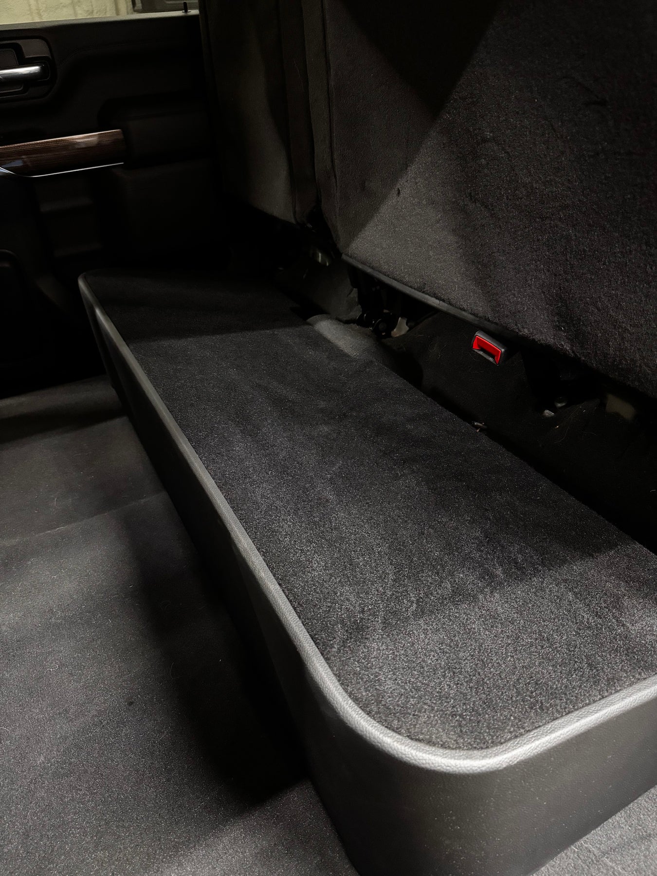Our Stage 1 enclosure is the perfect entry into a clean, OEM-plus upgrade. Each box is designed specifically for your truck and the exact subwoofers you’re running, ensuring proper airspace, fitment, and performance under the rear seat.